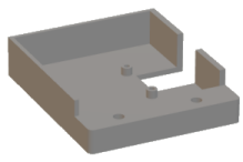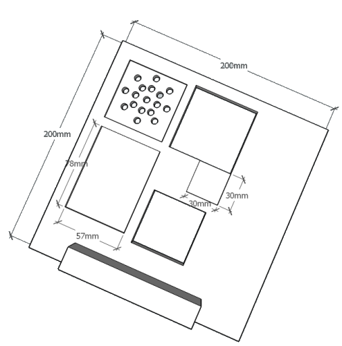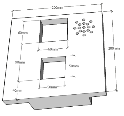 Quelques mesures sont données sur le dessin du support vue de face et d'arrière, en sachant que les découpes doivent correspondre aux dimensions des pièces réalisées à l'imprimante 3D. Tout ceci n'est qu'indicatif, chacun peut réaliser la mise en boitier en fonction de son équipement et de ses envies.