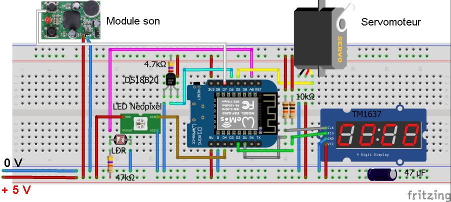 Le montage est alimenté en 5V mais les entrées sorties de l'ESP8266 fonctionnant avec le niveau logique 3,3 V, on utilise le régulateur de la carte pour plusieurs composants.