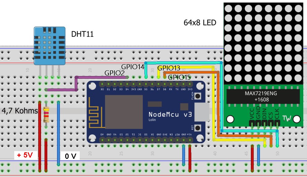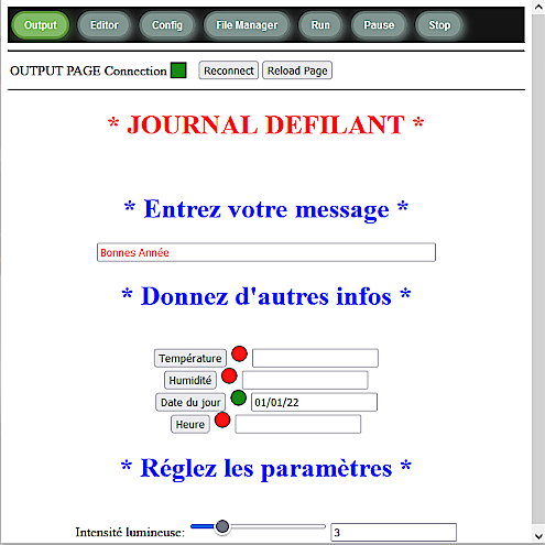 J'utilise un ESP8266 et 4 afficheurs à matrice à LED de 8 x 8. L' ESP8266 est connecté en wifi au réseau local, une page HTML permet les réglages du journal défilant.