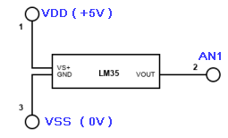 Le LM35 est à brancher avec : GND -> 0 V, + Vs -> +5V , OUT -> AN1.