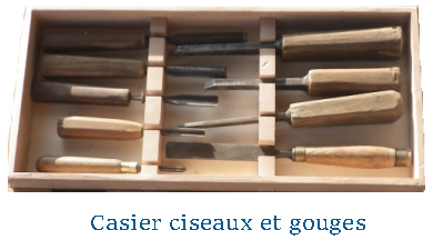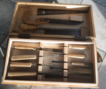 Voici le contenu de la caisse sans la scie à dos, égoîne et à guichet, les 5 gouges, ciseaux et bédanes .