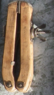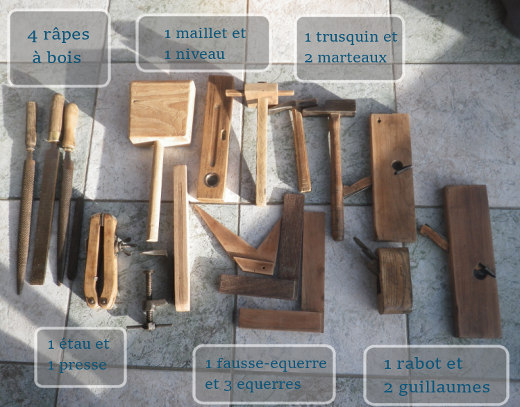Certains outils ont été certainement fabriqués par le menuisier comme la fausse-équerre ou ce petit étau dont les écrous sont carrés, les mâchoires en chêne se terminant par 2 mors en acier.