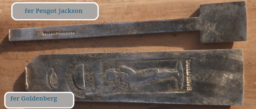 Le 1er fer de guillaume est un Peugeot Jackson compagnie fondée en 1863 qui deviendra en 1878 Peugeot Ainés et Cie.Le 2nd est un fer de rabot Goldenberg Sans rival. Ce type de fer a été produit en 1850 pour célébrer l'acier français avec comme marquage la silhouette de Napoléon.