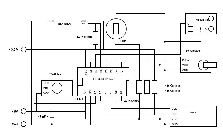 Le montage est alimenté en 5V mais les entrées sorties de l'ESP8266 fonctionnant avec le niveau logique 3,3 V, on utilise le régulateur de la carte pour plusieurs composants.