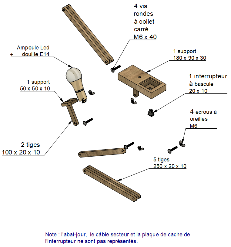 Le dessin en éclaté spécifie les dimensions des pièces et leurs formes.
