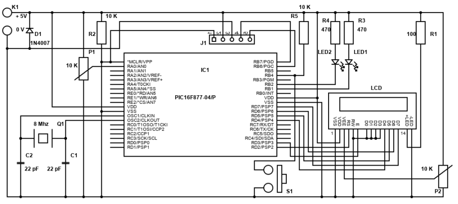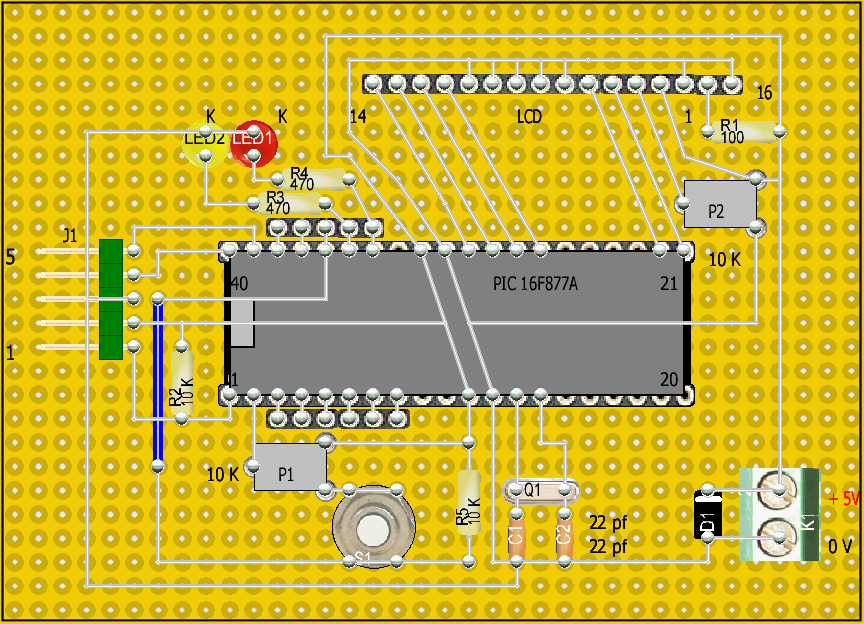 - le potentiomètre règle une valeur de consigne de 0 à 50 °C, mais le pas de 10 mV du LM35 n'est pas adapté au CAN du pic avec une référence à 5 V, la conversion manque de précision car l'échelle est trop grande. Une référence externe de 1 V permettrai une mesure plus précise jusqu'à 100 °C. Dans ce cas, il ne faut plus utiliser le potentiomètre pour le réglage car il est relié au 5 V.
