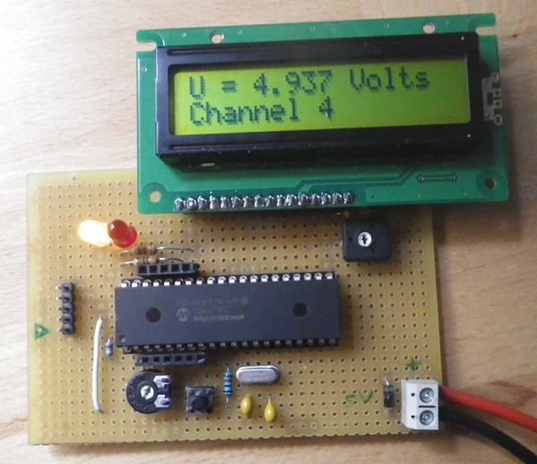 Il met en oeuvre le CAN d'un PIC16F677, mesure des tensions sur les entrées analogiques et affiche le résultat sur un écran LCD.